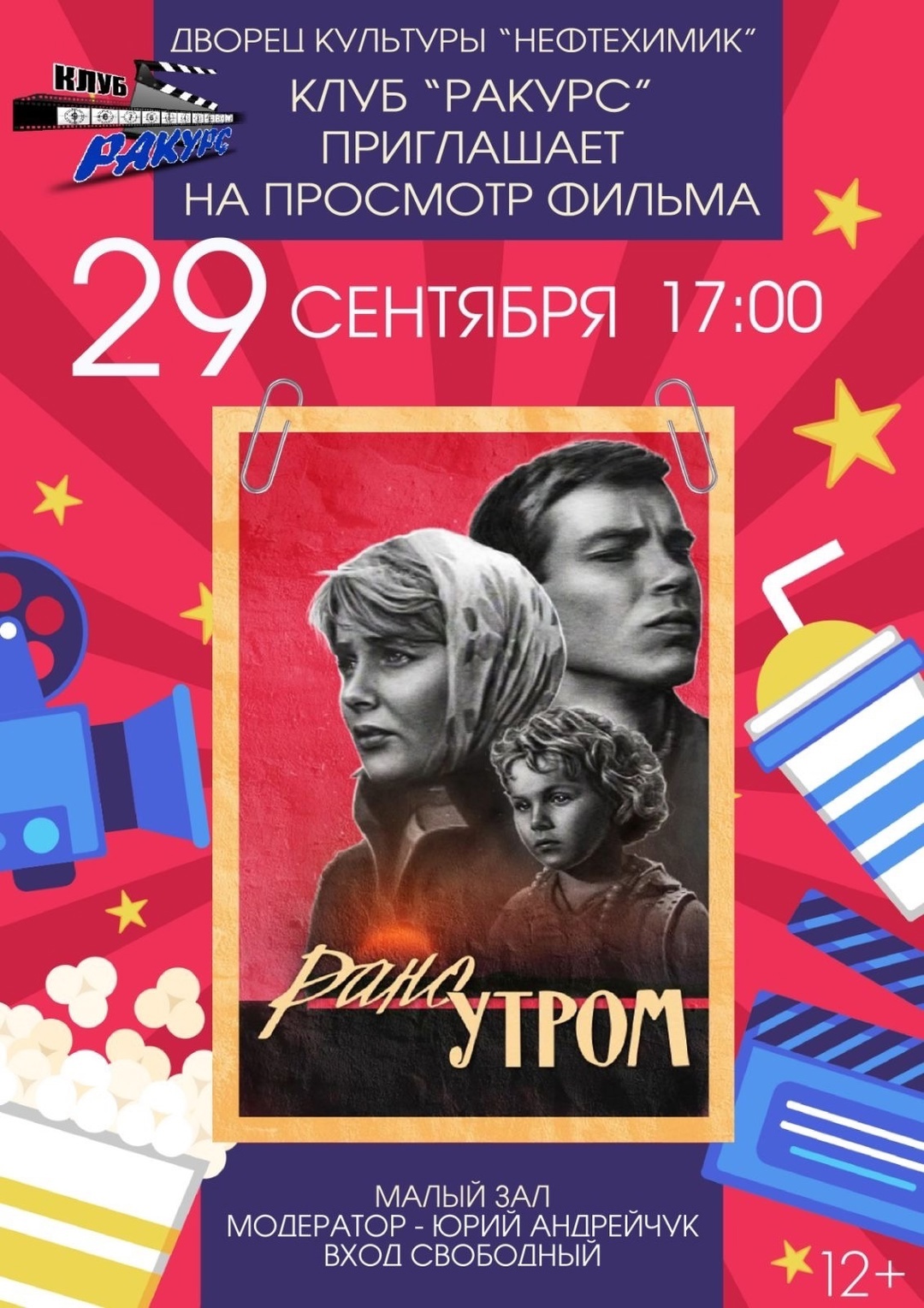 Клуб любителей кино "Ракурс" приглашает 29 сентября в 17:00 в ДК "Нефтехимик" на просмотр фильма. Вход свободный.