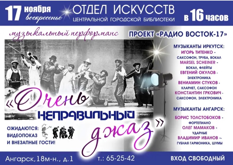 Приглашаем на похожий на лекцию, но не являющийся классической лекцией перформанс, где будет рассказ о великих джазовых музыкантах прошлого: Майлзе Дэвисе, Билли Холидей, Джоне Колтрейне, Бадди Болдене, Дюке Эллингтоне и других. Об их неправильности расскажут и сыграют восемь музыкантов из Иркутска и Ангарска.