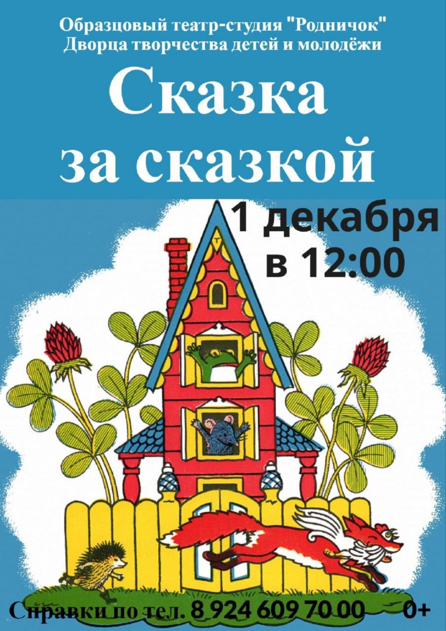 1 декабря в 12:00 мы ждём всех ребятишек и родителей на спектакль "Сказка за сказкой" во Дворце творчества детей и молодежи! Этот спектакль состоит из трех сказок Самуила Яковлевича Маршака: "Теремок", "Сказка про козла" и "Петрушка-иностранец".