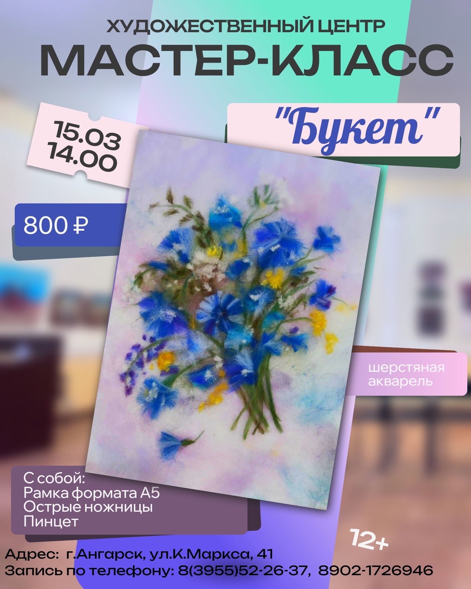 Приглашаем всех желающих на мастер-класс по шерстяной акварели «Букет» в Художественном центре 15 марта.