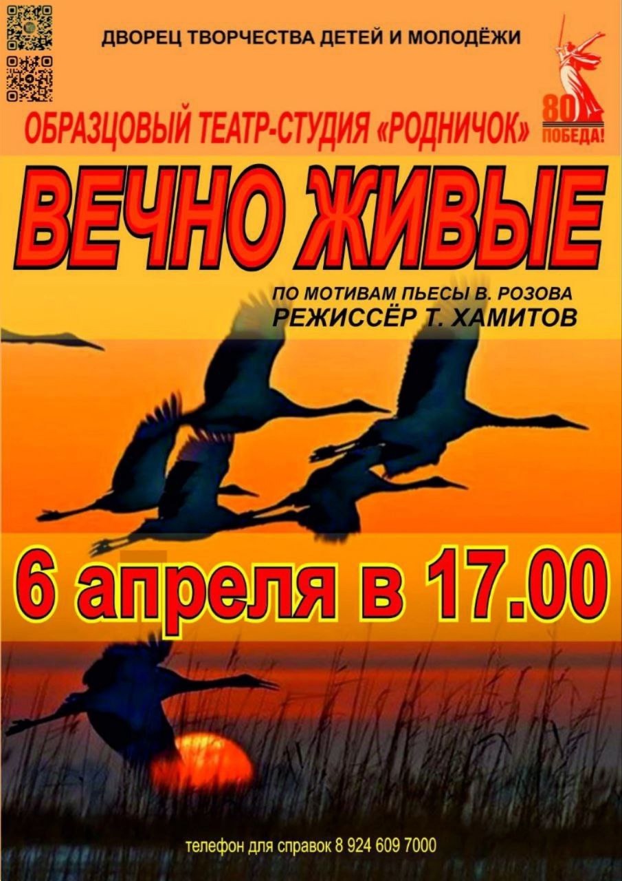 Театр «Родничок» приглашает в 17:00 во Дворец творчества детей и молодежи на проникновенную драму «Вечно живые» – историю о любви, выборе и цене человеческой судьбы в годы войны. «Вечно живые» – это память о тех, кто не вернулся, о героях, чьи подвиги остаются в наших сердцах.