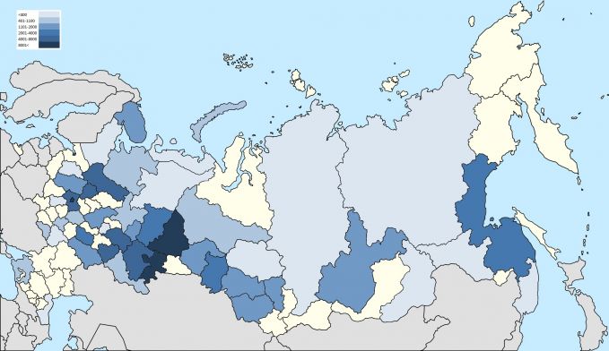 Большая концентрация вокруг Москвы (Московская область, Тверская и Ярославская) и на Урале (Пермский край, Башкортостан, Свердловская и Челябинская области).