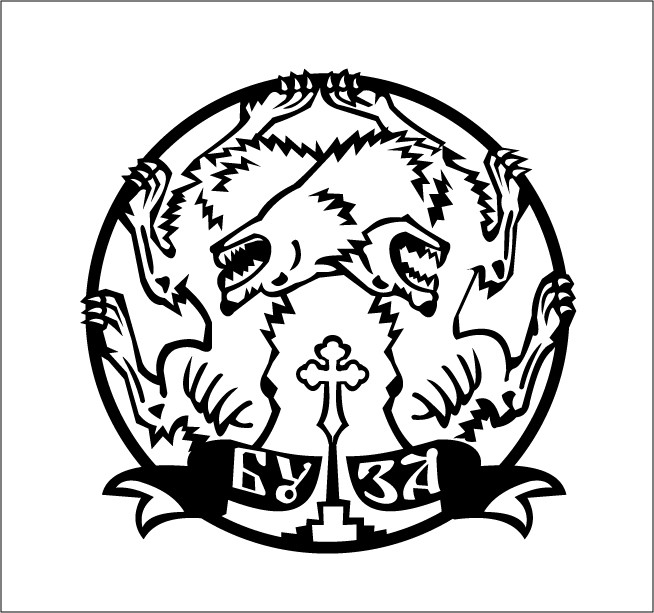 Символ изображает двух грызущихся волков. Тела зверей S-образно изогнуты, хвосты сплетены. В центре между ними расположен крест. Символ называется «Сердце воина». Обозначает вечную борьбу добра и зла за сердце человека. От личного выбора человека, от того, чью он примет сторону, зависит, каким будет его сердце, а следом и поступки. У Достоевского есть простое и ясное высказывание: «Бог с дьяволом борется, а поле битвы - сердце человеческое». Эти слова великого писателя полностью поясняют смысл эмблемы Бузы – «Сердце воина».