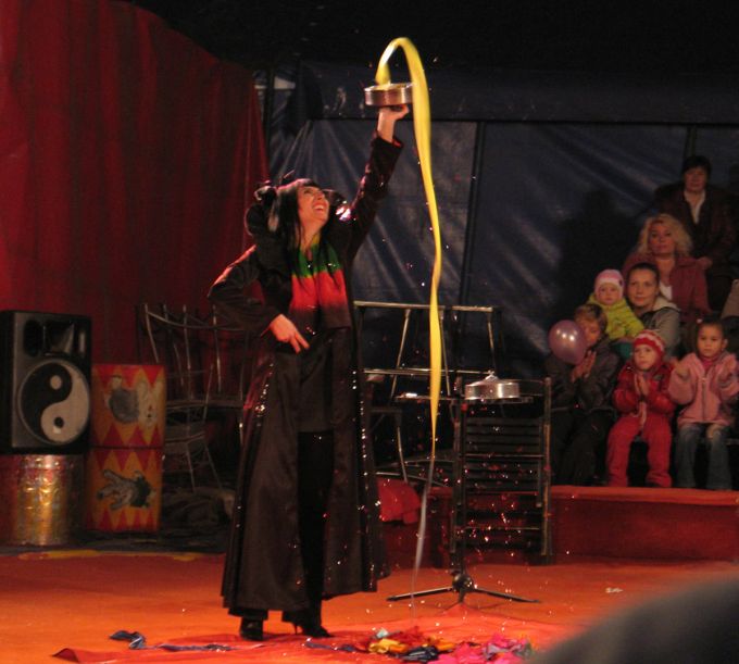 Посмешил пони, не откликаясь на указ дрессировщика перевернуться через спину. Как уверенно и непоколебимо махала головой эта маленькая лошадка – нет! Но когда зрители начали призывающее хлопать – давай, давай! – выполнила таки кульбит! Ребятня была безумно рада, что помогла-таки дрессировщику выполнить номер! Фокусники-иллюзионисты – обманщики те еще… Ну не могла эта девушка поместиться в такой маленькой коробочке! Не могла!!!... Ладно, посмотрите – сами поймете… Я так и не понял – куда она делась, и как снова появилась в этом параллепипеде, где может поместиться только сама…. А его ведь еще и пронзали цилиндрами!...
