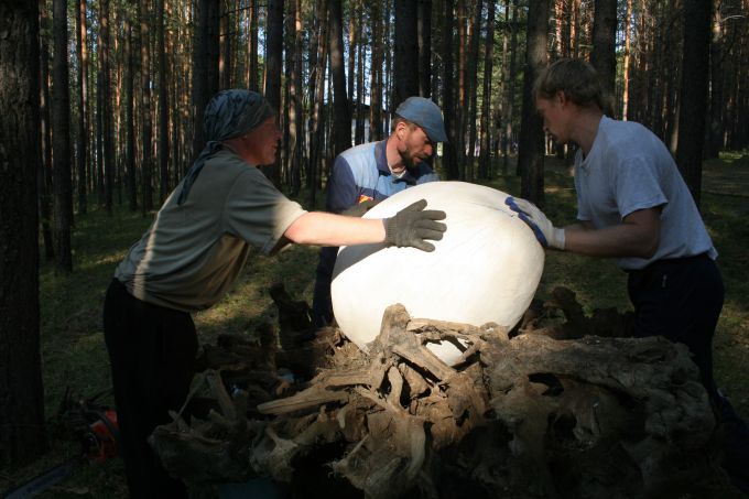Ангарскую сосну для мастеров предоставило ЗАО «Савватеевское». Автор фото: Шура ШестаковМатериал - знаменитая ангарская сосна, четырехметровые бревна до 90 сантиметров в диаметре, - открывал необъятный простор для творчества. Впрочем, гостям и этого показалось мало: за время фестиваля художники буквально вычистили окружающий лес от бурелома и замысловатых коряг. Основу одной из композиций - гигантский пень с полтонны весом - даже выволокли из протекающей поблизости Оды. Перевернутый корнями вверх, топляк стал гнездом для огромного яйца, которое насиживает невиданная птица, охраняемая двумя драконами. Одного из горынычей, крылатого, авторы - Александр Парфенов из Барнаула и Андрей Кошелев из Красноярска - подвесили на тросах меж окружающих сосен.
