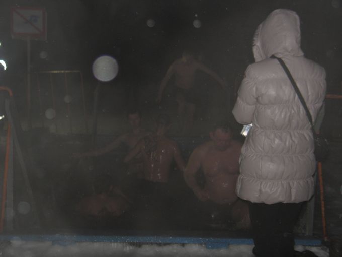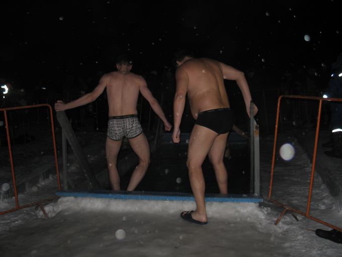 После полуночи десятки и сотни ангарчан потянулись к традиционному для нашего города месту купания - к иордани на реке Китой за 95 кварталом. Возле самой проруби находятся одновременно около 100 жителей города. Ещё человек 50 - это сотрудники полиции, ГИБДД и солдаты из воинской части: все они следят за порядком. Особого ажиотажа и давки в проруби не наблюдается, в среднем за минуту окунаются 3-4 человека. На улице очень морозно, но все выходящие из воды, говорят только одно "Хорошо!"