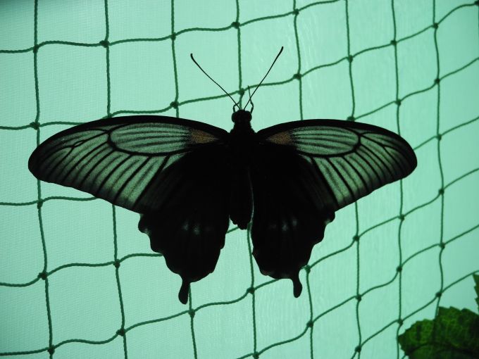 Бабочки огромные (некоторые - больше ладони), летают по помещению свободно, садятся на посетителей