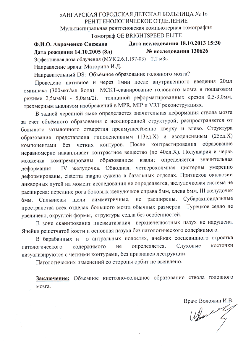 Замечательной девочке, АВРАМЕНКО СНЕЖАНЕ, ученице школы №7 класса 2«Б», требуется помощь! Ребенку требуется радиохирургическое лечение при помощи "Гамма-ножа". Диагноз - глиома ствола головного мозга.