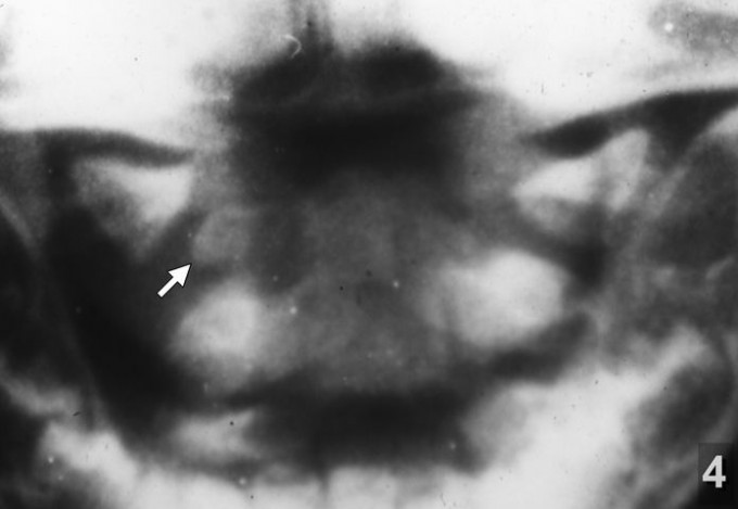 При одних и тех же повреждениях клиническая картина родовых травм шейного отдела может существенно различаться, что объясняется вариабильностью развития сосудов мозга у человека. Так, в моих наблюдениях при смещениях I шейного позвонка относительно II (рентгенограмма 1) чаще всего обнаруживались относительно негрубые неврологические симптомы, но были нередки случаи, когда они являлись причиной и острых нарушений кровообращения головного и спинного мозга. Однако наибольшую угрозу для жизни и здоровья детей представляли смещения атланта относительно затылочной кости (рентгенограмма 2) и переломы атланта (рентгенограммы 3 и 4), которые обычно приводили к тяжёлым и трагическим последствиям.