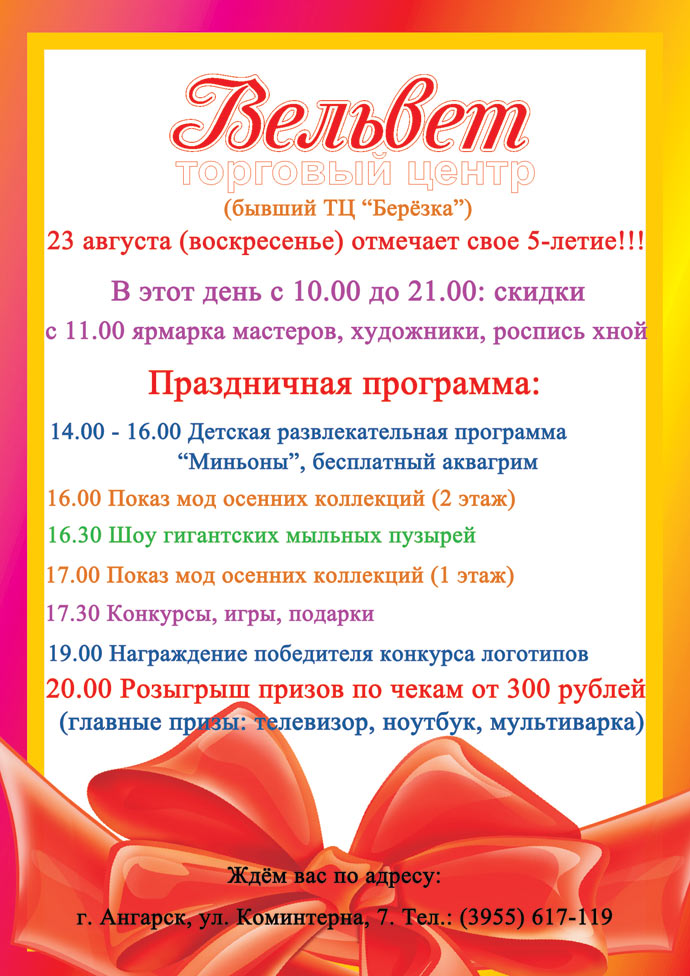 23 августа (воскресенье) ТЦ «Вельвет» (бывший ТЦ «Берёзка») отмечает свой день рождения и приглашает всех отпраздновать его!