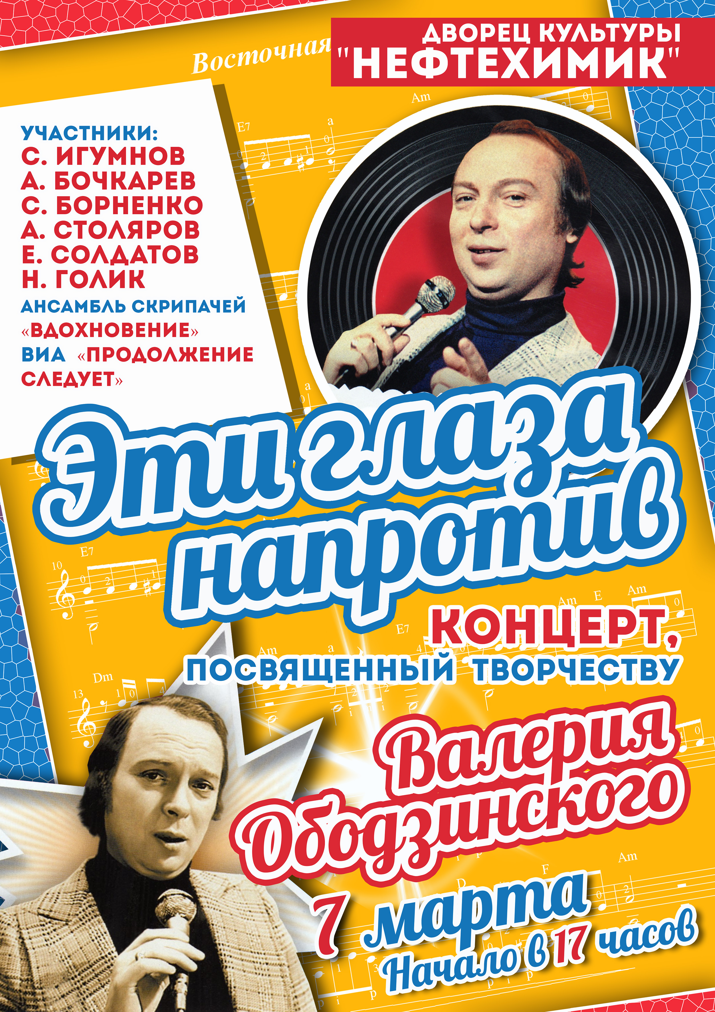Приглашаем вас 7 марта в 17:00 в ДК "Нефтехимик" на праздничный концерт "Эти глаза напротив", посвященный творчеству Валерия Ободзинского. Лучшие вокалисты и музыканты в этот вечер исполнят для вас самые известные хиты: "Восточная песня","Эти глаза напротив","Что-то случилось","Колдовство" и другие.