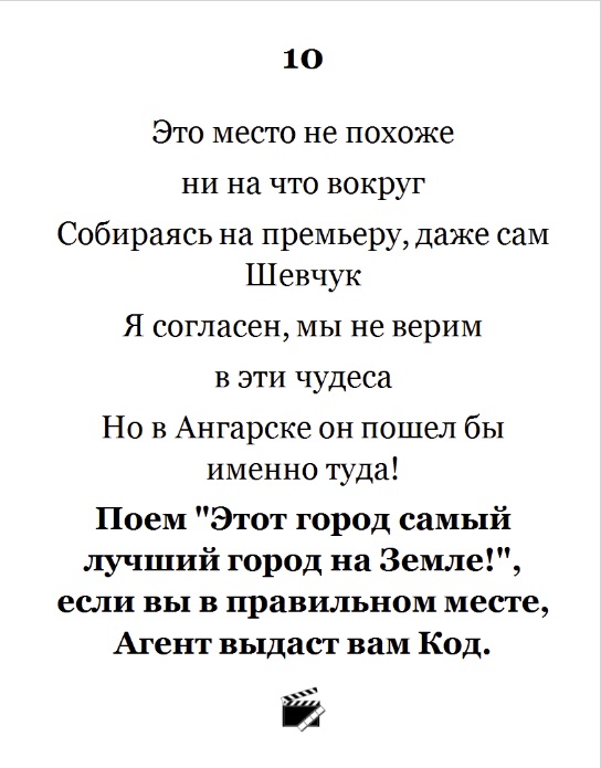 10 Расшифровка: "Собираясь на премьеру" - указывает на кинотеатр. У Шевчука есть знаменитая песня "Родина"...."Еду я на родинууууу"... Поем песенку, получаем наклеечку от Агента.