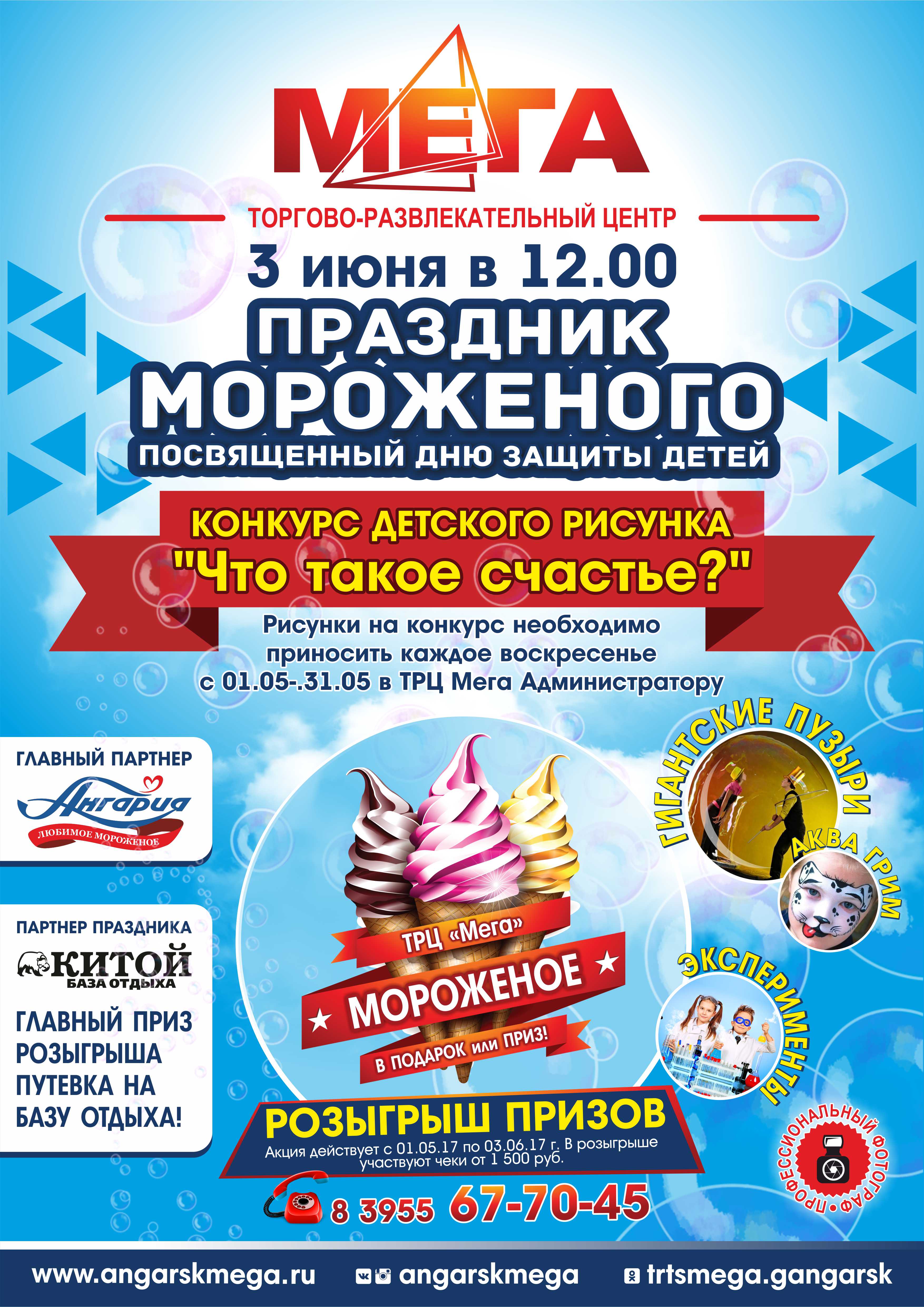 3 июня, с 12 до 16:00, в честь Дня Защиты детей! Грандиозный МЕГА-праздник мороженого со вкусом счастливого детства! Генеральный партнёр мероприятия - Фабрика мороженого "Ангария"!