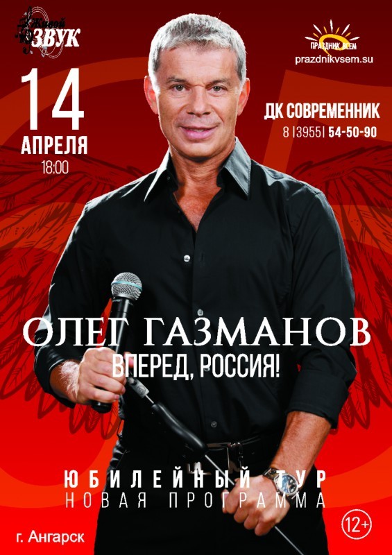 14 апреля в ДК "Современник" ангарчане увидят новую программу Олега Газманова "Вперед, Россия!". Начало концерта в 18:00.