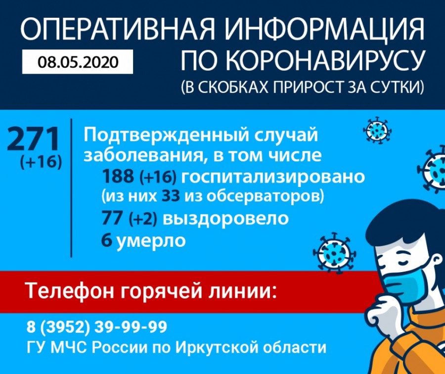 По информации оперативного штаба на утро 8 мая, в Иркутской области выявили еще 16 случаев заражения COVID-19. Общее количество инфицированных — 271 человек.