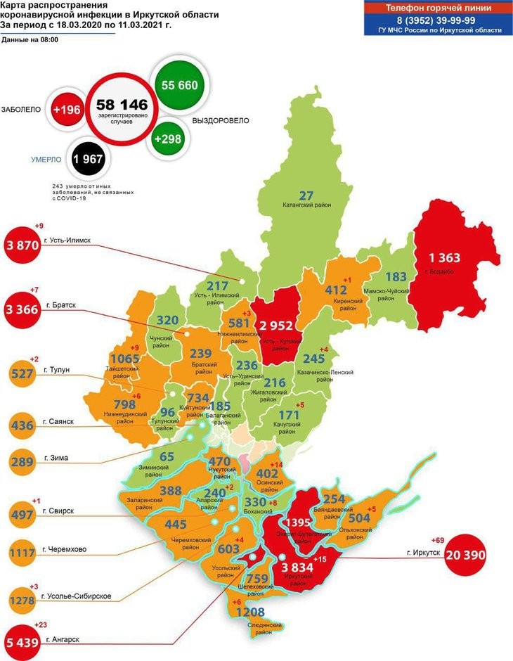 За сутки в Иркутской области зарегистрировано 196 новых случаев заражения коронавирусом, из них 69 — в Иркутске. По данным оперштаба на 11 марта, общее число подтвержденных случаев в регионе составляет 58 146 (в Иркутске — 20 390).