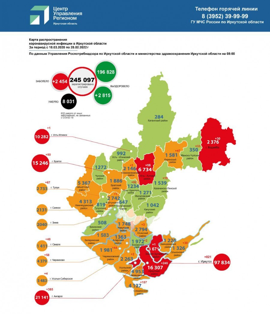 За прошедшие сутки в Иркутской области коронавирусом заразились 2 454 жителя. Всего с начала пандемии в регионе зарегистрировано 245 097 случаев заражения COVID-19, сообщает оперштаб 28 февраля.