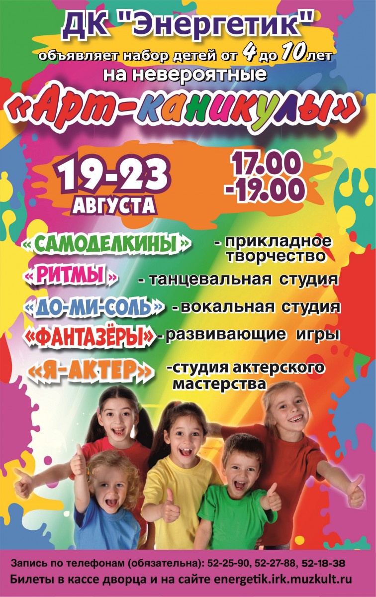 Дворец культуры "Энергетик" приглашает мальчиков и девочек в возрасте от 4 до 10 лет провести последний летний месяц весело, ярко, творчески!