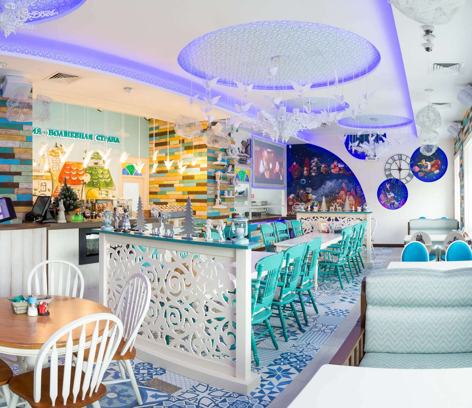 – Концепция дизайн-проекта была для нас очевидна. Детский ресторан – это прежде всего идеальное пространство для деток, мир, который подогнан именно под самых «маленьких» – сказочный, уютный, колоритный… Заложенная владельцами идея с ледяной комнатой дала нам кучу творческих возможностей. Ведь всем известно, что самый долгожданный детский праздник – Новый год! Что еще больше заставит ребенка поверить в сказку, если не посещение настоящей резиденции Деда Мороза! Волшебные ледяные скульптуры и чудное «обмундирование» – дивные муфточки и валеночки – окунут ваше чадо в настоящую ледяную сказку. А как приятно будет в канун Нового года или на собственный день рождения получить подарки от самого что ни на есть настоящего русского Деда Мороза! Чтобы не «заморозить» наших драгоценных деток, продумана еще одна анимационная комната со всеми необходимыми удобствами. Ребят здесь занимают и развивают профессиональные педагоги и аниматоры. Интерьер безупречен и комфортен для любого детского мероприятия, будь то «cook-up» или день рождения. Хочется отметить, что заведения для детей подобного уровня тяжело отыскать даже в столице. Во всем МЫ ПРОЯВЛЯЕМ трепетный и подлинно нежный подход к детям в целом. Я, в свою очередь, постаралась внести частичку своей души, собственного озорного восприятия и фантазии, чтобы интерьер был лаконичен по отношению к детской фактурности, индивидуальности и натуре. От всей души благодарю всю команду: скульпторов ледяных фигур, инсталляторов и художников. Хочется верить, что тандем местных и столичных мастеров превзойдет все ваши ожидания.