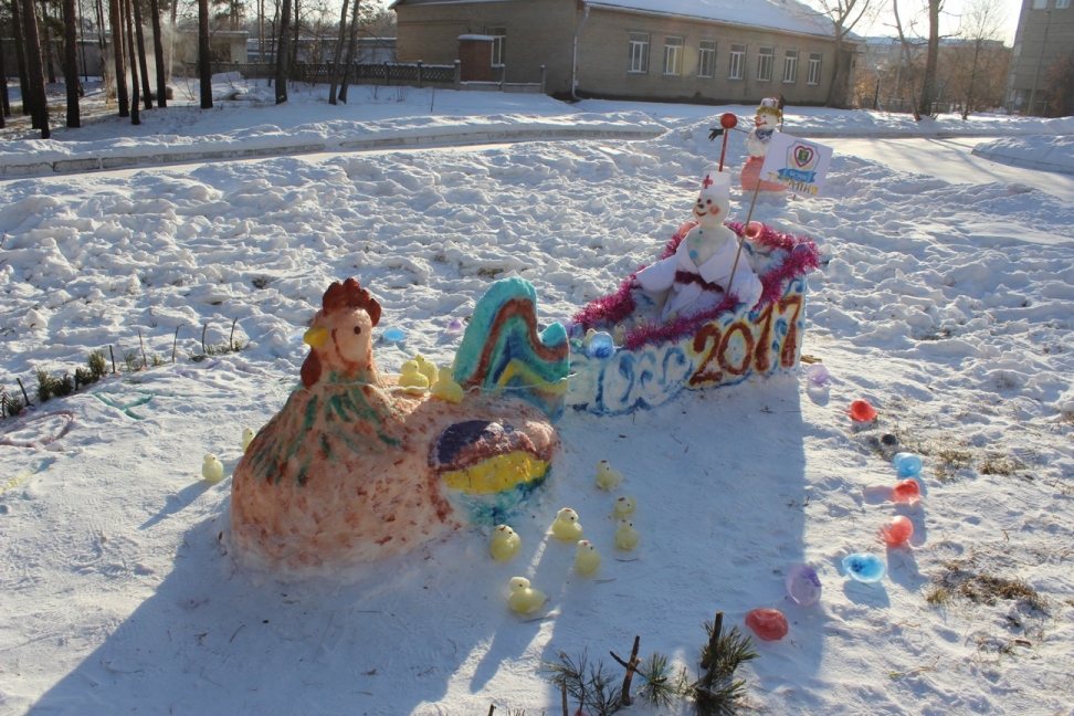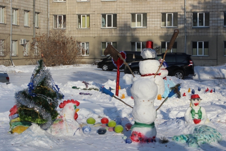 Поскольку в этом году определённой тематики у конкурса не было, то кардиологическое отделение стационара представило совсем необычную снежную композицию. Здесь и петух – символ наступающего года, и снеговик вверх тормашками, и русалка.