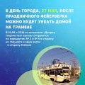 В День города, 27 мая, после праздничного фейерверка можно будет уехать домой в трамваях и в квартальскую часть города, и в старую. В 22.50 и 23.10 от остановки «Дворец творчества» (бывшая остановка маг. Тимур) по наполнению вагонов трамваи отправятся по маршрутам № 3 и № 6 в сторону улицы Горького и один вагон – в сторону Майска.