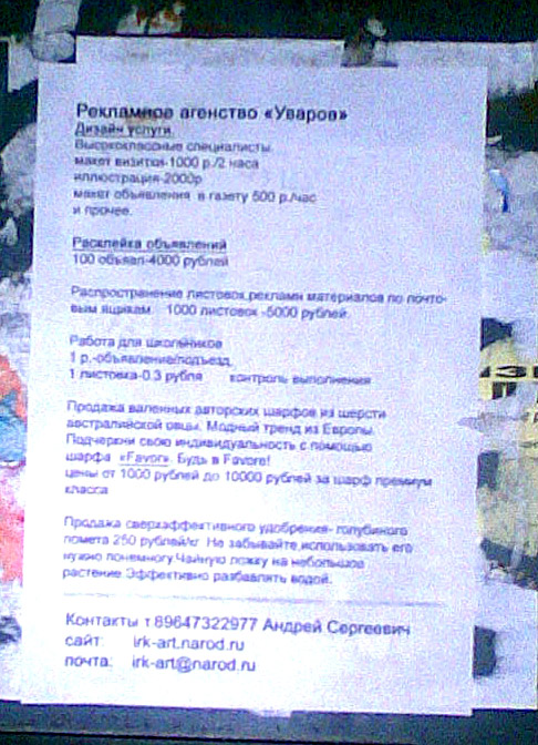 Попалась на глаза листовка рекламного агентства УВАРОВ. Ну, что сказать - спектр деятельности поражает - это и создание высоклассной рекламы и визиток. Это и продажа каких-то мега-шарфов из шерсти австралийской овцы. И самое главное - это поставки высокоэффективного удобрения - ГОЛУБИНОГО ПОМЕТА. Особо поразило наличие у агентства УВАРОВ своего сайта - оный был немедленно изучен на предмет других приколов. ( и это ещё не всё ) |