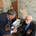 Первым накануне торжественных мероприятий ветерана поздравили мэр Ангарского округа Сергей Петров и его заместитель Марина Сасина.