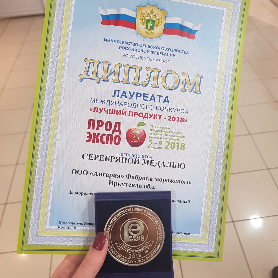 Третий год ООО «Ангария» Фабрика мороженого» принимает участие в крупнейшей международной продовольственной выставке «Продэкспо» и второй год получает награду в конкурсе «Лучший продукт», проводимого в рамках этого мероприятия. ( и это ещё не всё ) |