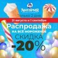 Фабрика мороженого «Ангария» дарит праздничное настроение и скидки до -20% на весь ассортимент мороженого в фирменных магазинах Ангарска и Усолья-Сибирского. Долгожданная распродажа - акция «Скидка -20% на всё мороженое»!