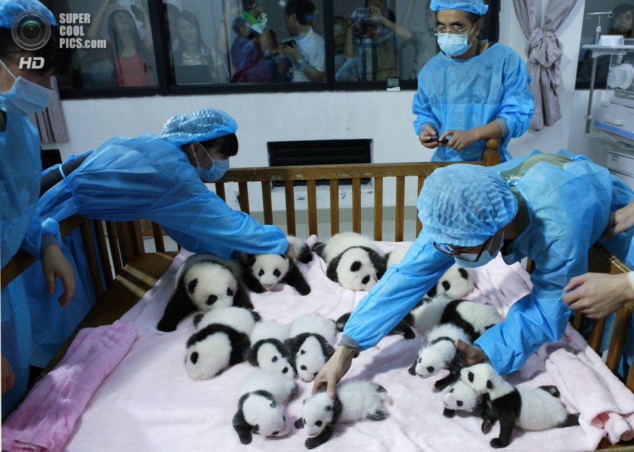 В прошедший понедельник администрация научно-исследовательской базы по разведению больших панд в Чэнду представила прессе 14 детёнышей «бамбуковых медведей». Все животные появились на свет с июля по сентябрь этого года в результате искусственного разведения. На сегодняшний день они содержатся вместе в одних «яслях», где находятся под пристальным наблюдением специалистов. ( и это ещё не всё ) |