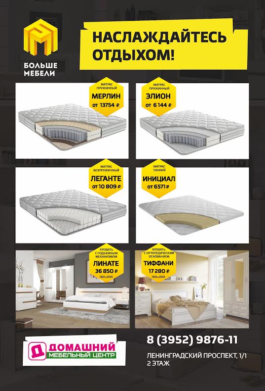 В августе на втором этаже мебельного центра «Домашний» открылся новый салон трендовой мебели из Белоруссии, кресел и кресел – качалок – «Больше Мебели». В салоне представлены коллекции, которые по достоинству оценят покупатели. К ним относятся Милан, Оскар и Вена. Новейшие коллекции этого сезона: Линате, Тиффани, Оливия, Прованс - уже стали хитом продаж. Мы предлагаем нашим клиентам возможность покупки мебели по недорогим ценам от производителя без наценки. Цены на корпусную мебель зависят от Ваших предпочтений: это может быть эконом, средний и высокий класс. Также в салоне «Больше мебели» представлен широкий выбор удобных кресел, кресел-качалок и пуфов, которые удовлетворят вкус любого покупателя, предъявляющего самые высокие требования к дизайну и эксплуатационным характеристикам мебели. В салоне также представлены и ортопедические матрасы. На выбор потребителю более 150 моделей матрасов, включая модели круглых форм, которые отвечают всем возможным преставлениям о комфорте. Оптимальное соотношение цены и качества, а также индивидуальный подход и внимательное отношение к нашим клиентам - первое, что Вас ждет при знакомстве с нашим салоном. Мы формируем свой ассортимент, опираясь на изучение покупательского спроса, современной мебельной моды, пожеланий и вкусов наших клиентов. Надежность от компаний «Анрекс» , «ГринТри», «Торис» и «Magic Sleep» уже проверена годами качественной службы.