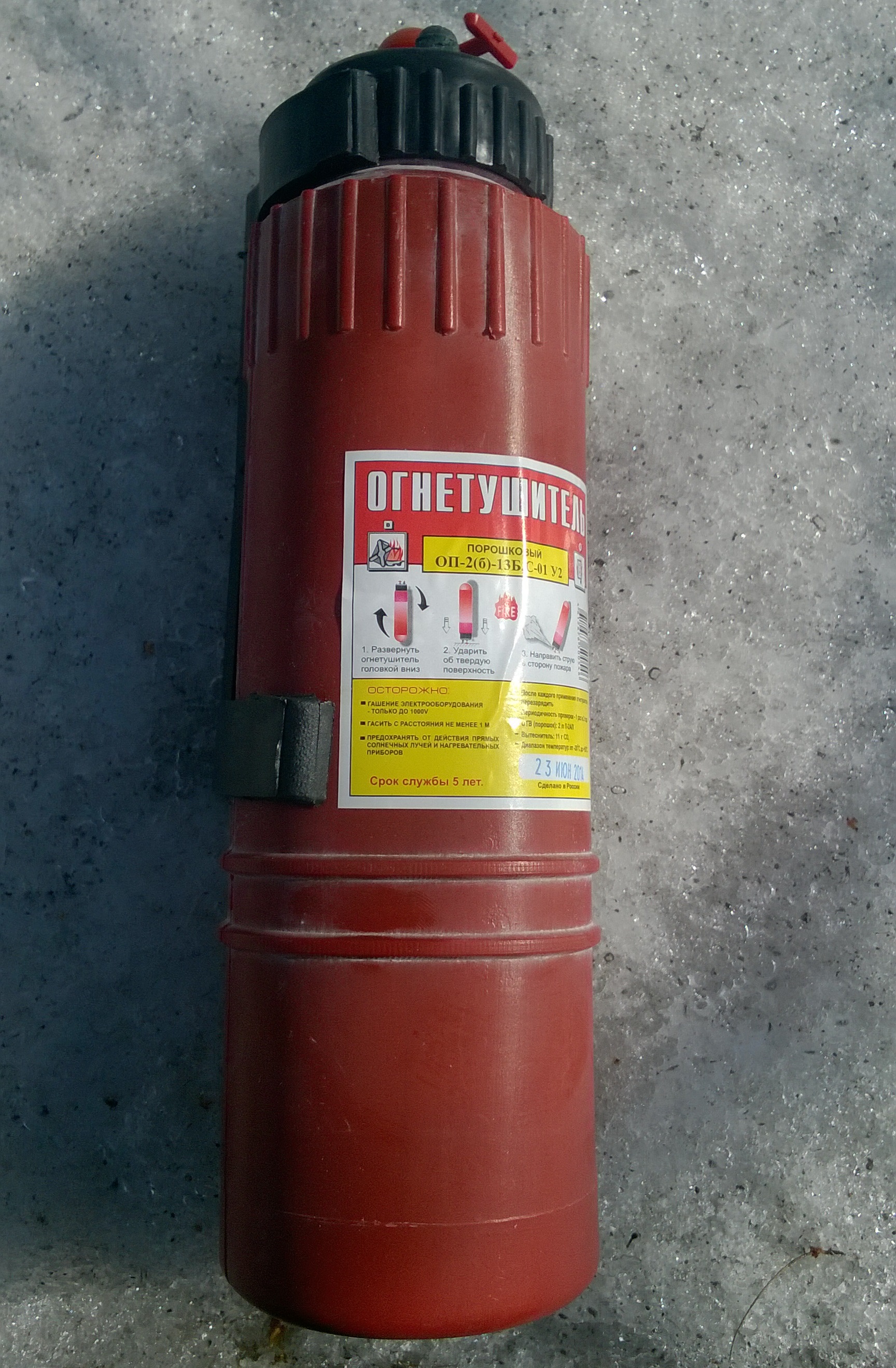 При ближайшем рассмотрении огнетушителя его настоящее происхождение выяснить не удалось, написано лишь "Сделано в России". Дата производства указана 23 ИЮН 2014. Срок службы 5 лет.