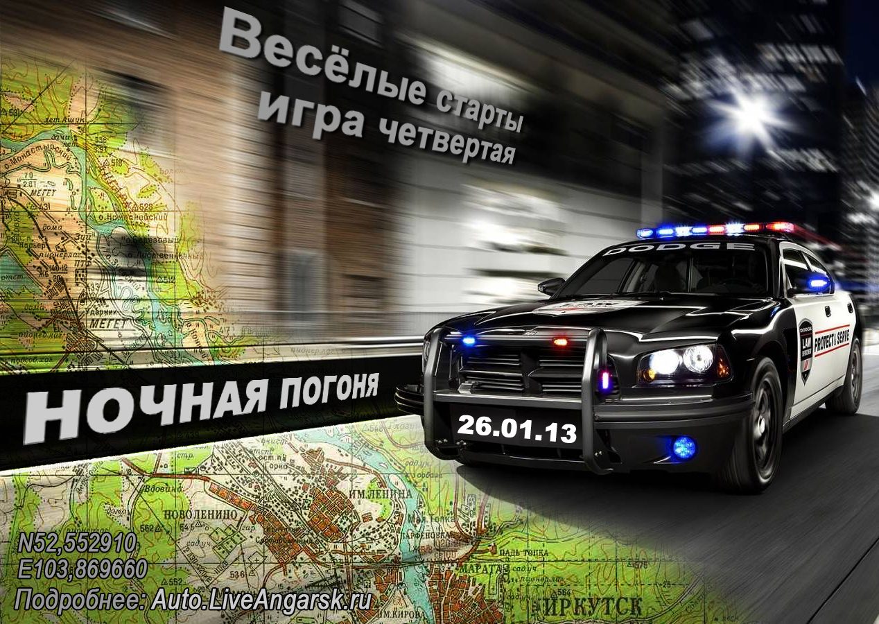 Приветствуем всех участников на 4-й игре "Веселый старты - Ночная погоня" от команды ДПС. Несколько дней ушло на подготовку к этой игре. В итоге сегодня, в субботу 26 января, мы имеем: 13 контрольных точек, один клад, бонусные задания и стимулирующие призы, которые достанутся самым быстрым экипажам. Впервые на этой игре на всех точках прикреплены флаеры, по которым первооткрыватели получат приз на Финише.