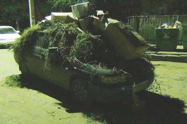 Неправильно припаркованную машину завалили мусором и сорняками (видео)