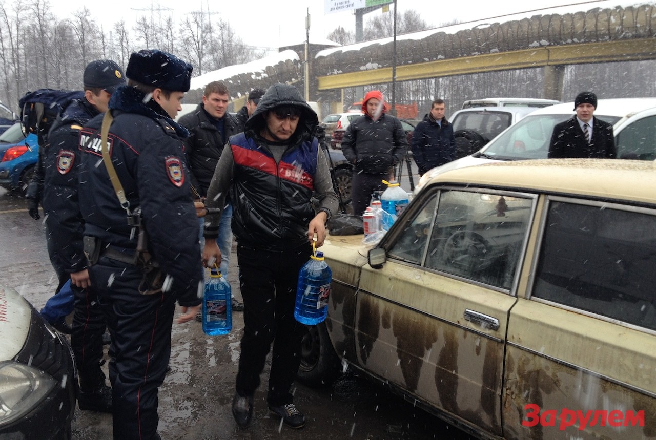 МКАД еле полз, шел снег, из-под колес летела грязь – кажется, самое время для торговцев омывайкой, но они все словно под землю провалились. До первой точки ехали добрых десять километров. И когда приехали, ее уже «сворачивал» полицейский наряд, не участвовавший в нашей акции.