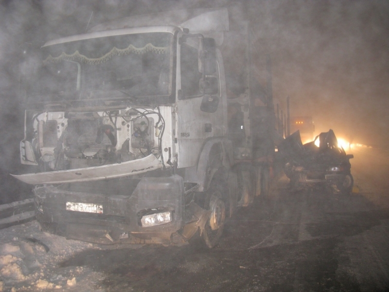 водитель автомашины ВАЗ-21150 в условиях гололеда и недостаточной видимости, ограниченной туманом, допустил выезд на полосу встречного движения, где совершил лобовое столкновение с автовозом Мercedes Axor.