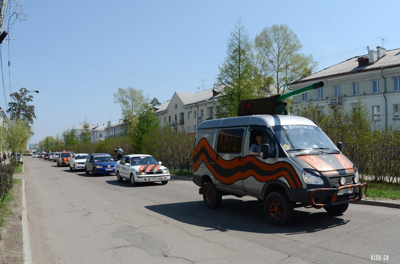 Большой и яркой колонной автолюбители поздравили ветеранов с Днём Великой Победы. 9 мая на улицах Ангарска и Иркутска было множество автомобилей, раскрашенных символами Великой Отечественной Войны. Громкое и позитивное автошествие придумали участники автосообщества DRIVE2.