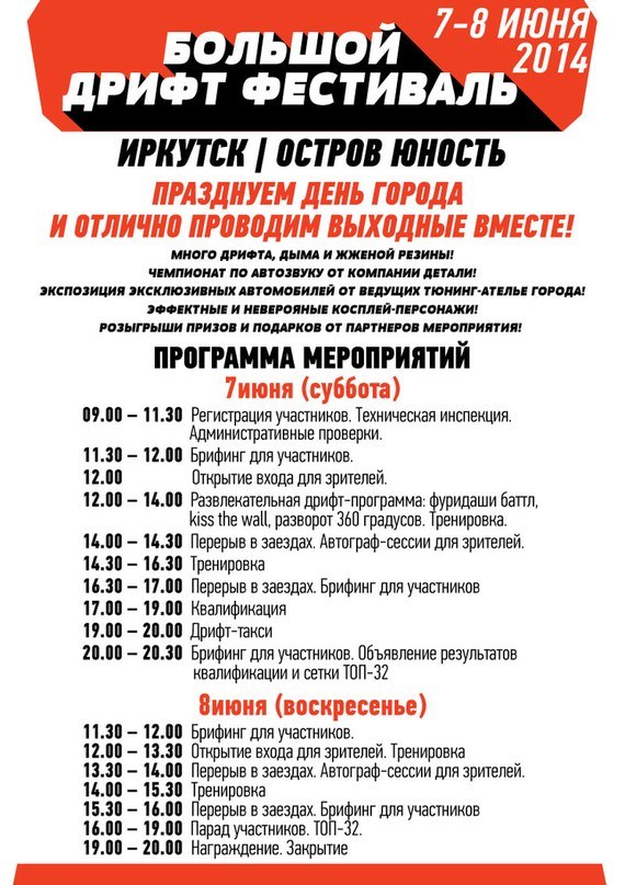 7 и 8 июня в Иркутске на острове Юность состоится второй этап Иркутск Дрифт битвы в рамках большого дрифт-фестиваля, приуроченного ко дню города! Ходят слухи, что на огонек заглянут гости и с другого берега Байкала, из Улан-Удэ.