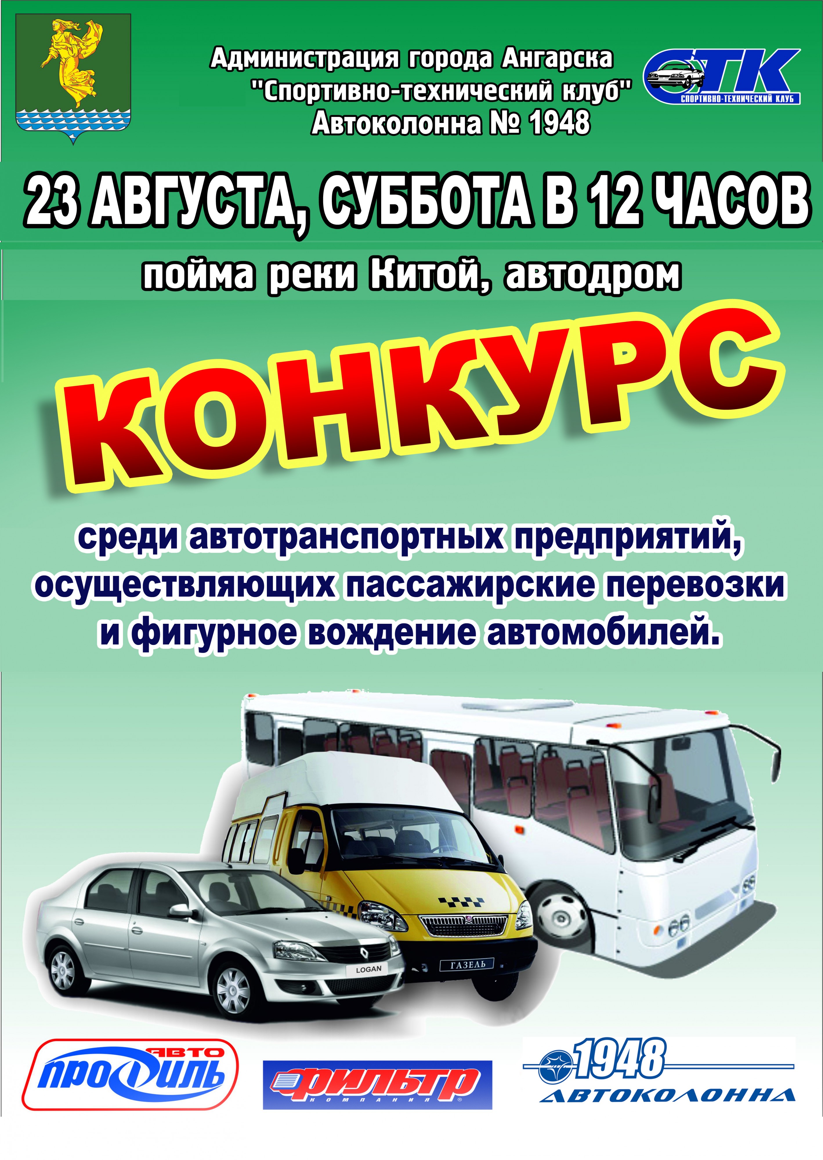 23 августа в субботу на автодроме в пойме реки Китой пройдет конкурс профессионального мастерства водителей городских автопредприятий и фигурное вождение легковой машины, маршрутки и автобуса большой вместимости.