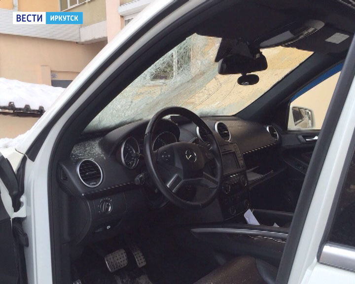 В Иркутске лавина снега и льда сошла с крыши семиэтажного дома на припаркованный автомобиль.