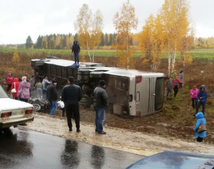 Водитель Nissan Sunny допустил столкновение с автобусом, после которого автобус съехал в кювет и перевернулся. От удара Nissan отбросило на «Тойоту Марк 2», следовавшую в попутном направлении.