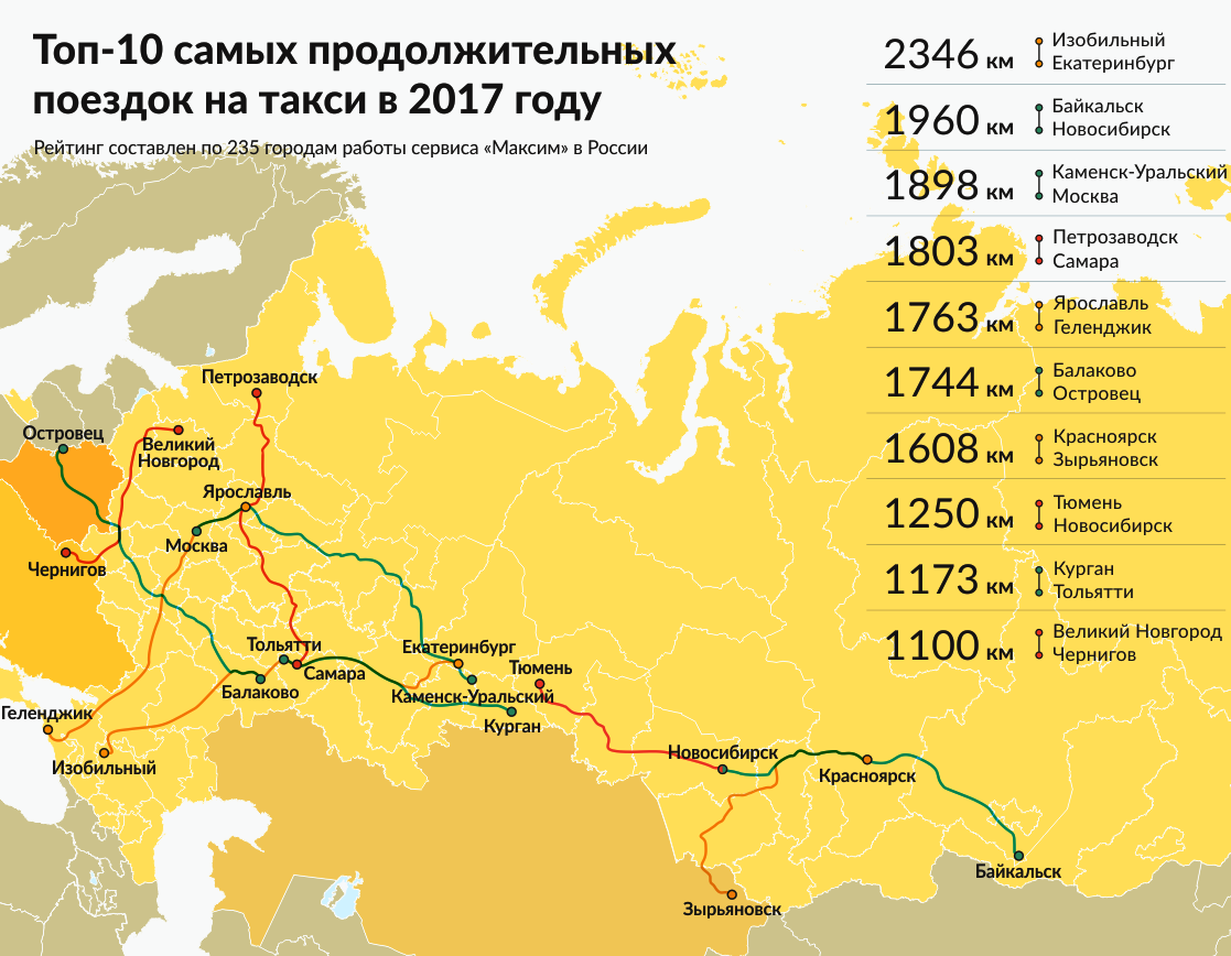 Известный сервис заказа такси составил рейтинг поездок, в которых начальные и конечные адреса разделяют тысячи километров. Такси популярно не только для передвижения по городу. В 2017 году жители России часто путешествовали на автомобилях между городами и странами. По данным сервиса, самая продолжительная поездка в этом году была из города Изобильный Ставропольского края в Екатеринбург Свердловской области. Пассажиры проехали более 2300 км до Мусульманского кладбища.