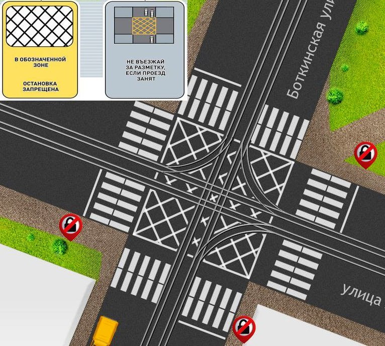 Запрещено выезжать на перекресток при условии, что весь путь водитель не сможет преодолеть без остановок и будет вынужден остановиться на разметке. Придется визуально проанализировать путь и убедиться, что впереди нет препятствий.