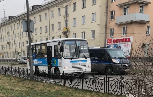 Сегодня утром на ул. Карла Маркса напротив магазина "Пальмира" столкнулись автобус маршрута №27 и инкассаторская машина ГК "Викинги".