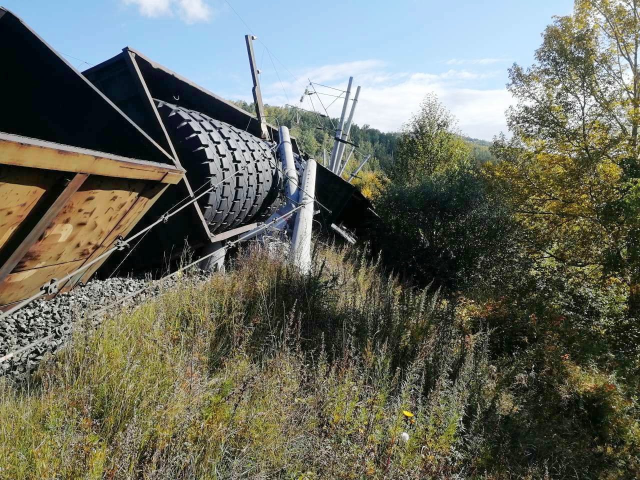 Пресс-служба МЧС отмечает, что всего в составе поезда было 62 вагона, наполненных автомобильными покрышками. Из-за схода вагонов повреждены четыре опоры линии электропередач и нарушено 40 метров железнодорожного полотна. В ликвидации происшествия задействованы более 70 человек и 13 единиц техники. Туда направлены спецпоезда для восстановления инфраструктуры дороги.