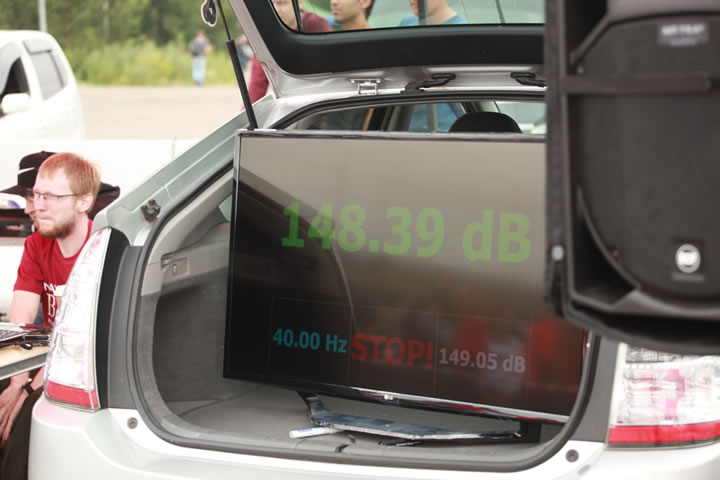 Как и рассказывал организатор, с помощью современного датчика, который устанавливали в салон автомобиля, измерялся уровень громкости звука. Все показатели выводили на монитор. При максимальных показателях стекла и обшивка машины вибрировали.