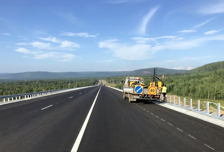 На участке уложен асфальт на площади 125 тысяч квадратных метров. Дорожники устанавливают более 11 тысяч погонных метров металлического барьерного ограждения. Начинается нанесение горизонтальной разметки термопластиком, установка дорожных знаков.