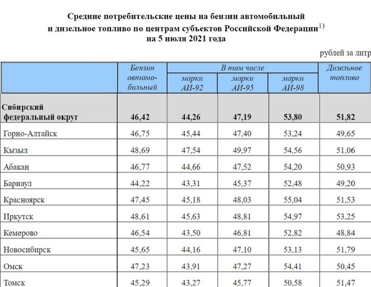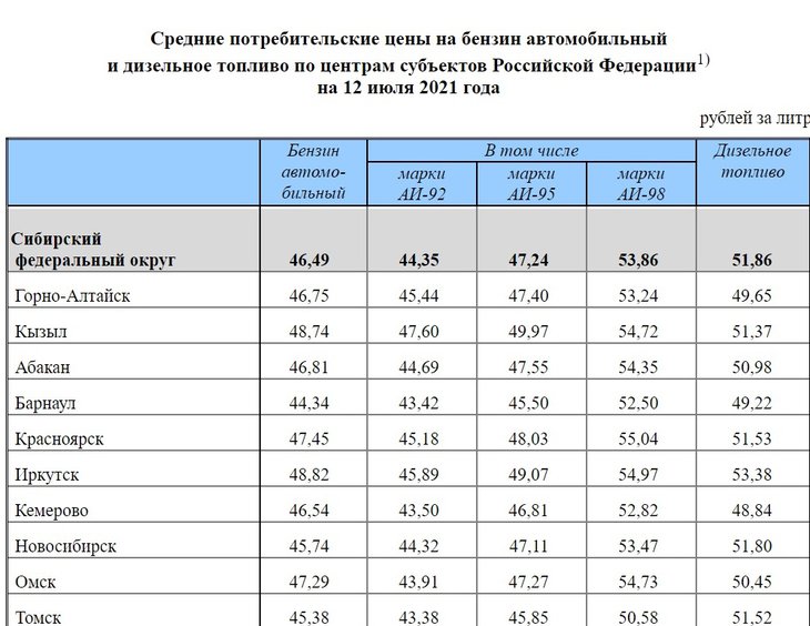 Среди регионов СФО, самый дешевый АИ-92 и АИ-98 — в Томске (43,38 рубля и 50,58 соответственно); АИ-95 — в Барнауле (45,50). Самое дешевое дизельное топливо продают в Кемерово — 48,84 рубля.