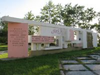 Перед мостом все осталось по-прежнему, прямо как в моем детстве: закрытый пост гаи, какие-то киоски со всем подряд. Теперь там еще стоит палатка, где продают пиво и все такое: лавочки, бутылки - короче, место культурного отдыха. Рядом с культурой стоит какая-то облезлая стела, по давности лет я уже помню, в честь чего она была поставлена, а ее нынешнее состояние не позволяет это понять вообще. На ней висит такой же облезлый щит с поздравлением АУСа с 55-летием (повесили, значит в 2003 году). С одной стороны стелу подпирает мусорка, а с фасада - биотуалет для посетителей вышеописанного культурного заведения.