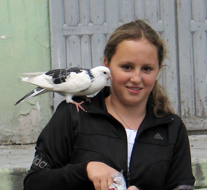 В пятницу проходил мимо первого лицея. Там по давней традиции обитает стая голубей, ее знают, наверное, все ангарчане. Естесственно, голубей там прикармливают все кому не лень. Однако, я уже много-много лет не видел, чтобы голуби там садились на плечи кормящим! В пятницу увидел: три девочки, стая голубей, мои удивленные глаза. Девочки предложили подарить мне голубей, я отказался, спросил разрешения их сфотать. Они спросили, куда. Я сказал - в инете выложу. Они похихикали над этим - мол, смотри, Лена, фотошопом обработают нас и на порно-сайт, из-за чего удивился второй раз - такие маленькие, а уже про фотошоп знают!